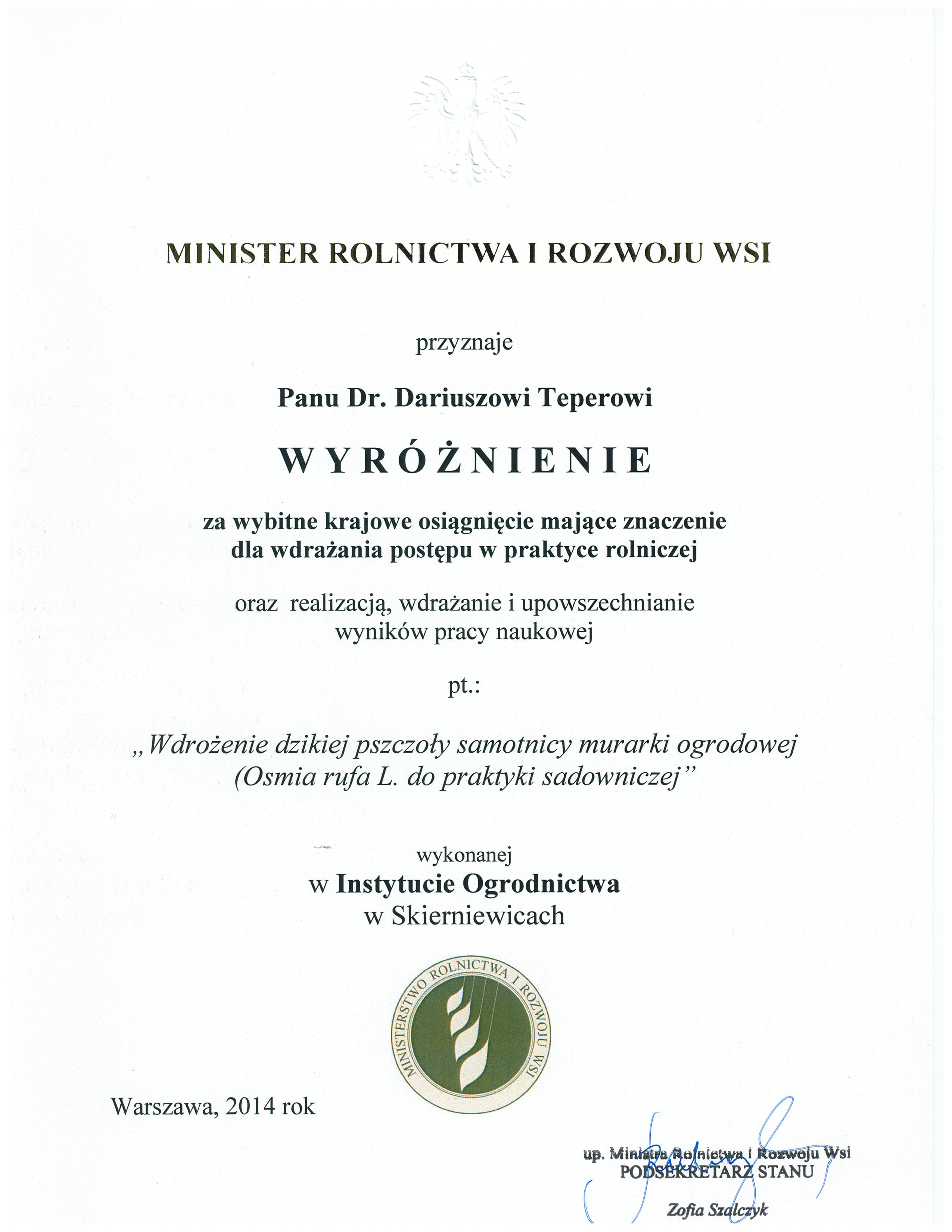 Wyróżnienie Ministra Rolnictwa i Rozwoju Wsi za wybitne krajowe osiągnięcia mające znaczenie dla wdrażania postępu w praktyce rolniczej za 2014 r.
