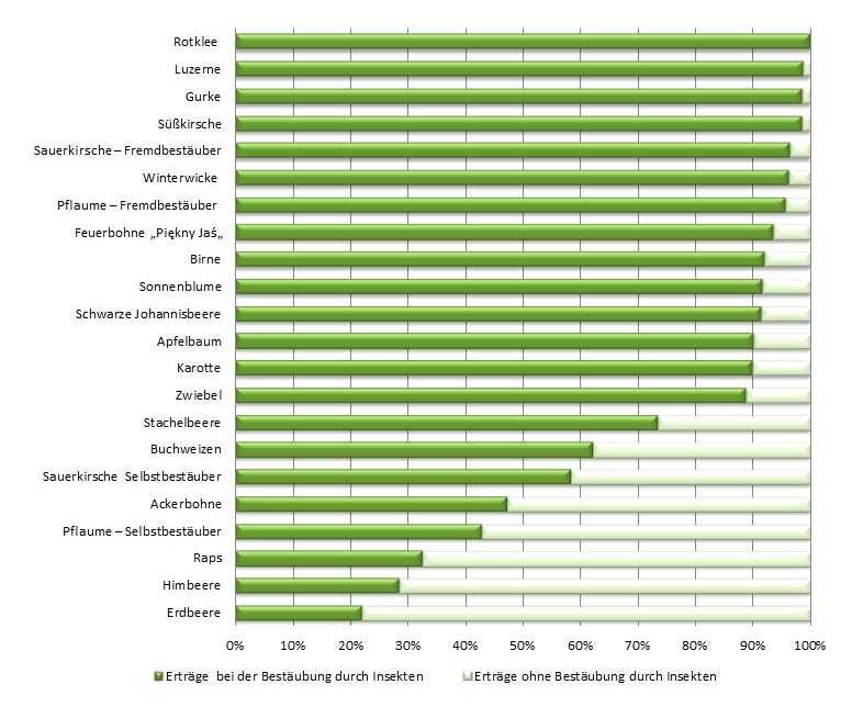 Das nachstehende Diagramm zeigt die Abhängigkeit der Obst - und Samenerträge bei einzelnen Kulturpflanzen von der Blütenbestäubung. In überwiegenden Fällen ist eine relevante Steigerung der Erträge sichtbar. Die Erdbeere und die Himbeere (s. Diagramm) scheinen anspruchslos gegenüber den Bestäubern zu sein, jedoch sind ihre Erträge um 25 - 35% niedriger und haben wesentlich schlechtere Qualität. Diese Beeren können nur als ein billiger Rohstoff für Verarbeitungsindustrie und nicht als Dessertobst preisgünstiger verkauft werden.
