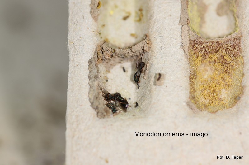 Inne groźne pasożyty kolonii murarek to muchówka - Cacoxenus i pasożytnicza osa - Monodontomerus. Te pasożyty również eliminujemy podczas analizy gniazd, a także paląc resztki kokonów pozostałe po wygryzieniu się murarek wiosną.