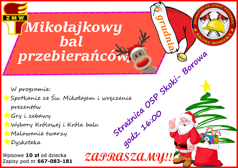 25 listopada 2015 W dniu 6 grudnia koło ZMW i OSP Skoki - Borowa organizują mikołajkowy bal przebierańców. Więcej szczegółów możecie Państwo znaleźć na plakacie.
