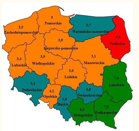 Szczególnie niepokojący jest niedobór pszczół w woj. mazowieckim, które przoduje w powierzchni upraw sadowniczych i produkcji owoców. Analizując bardziej szczegółowo, w powiecie grójeckim (3774 rodziny w 201 pasiekach/1269 km2), na 1 km2 powierzchni przypada średnio 3 rodziny pszczele (0,03 rodziny/1 ha). Przyjmując wymaganą średnią obsadę 3 uli na 1 ha sadu w tym powiecie powinno być 100 razy więcej rodzin pszczelich (!!!). Niewiele lepsza sytuacja ma miejsce, w równie ważnym sadowniczo, powiecie sandomierskim, gdzie na 1 km2 przypada średnio 3,5 rodziny pszczelej (0,035 rodziny/1 ha !!!) podczas gdy średnia dla woj. świętokrzyskiego to 5,5 rodziny/1 km2. Te dane odnoszą się do całej powierzchni powiatów, niemniej jednak świadczą o wysokich niedoborach zapylaczy na naszych uprawach.