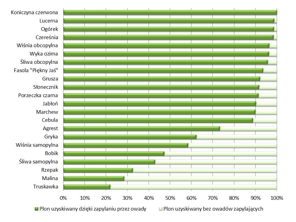 Poniższy wykres obrazuje zależność plonu owoców i nasion wybranych gatunków roślin uprawnych od zapylenia kwiatów. W ogromnej większości przypadków zwyżka plonu jest ewidentna. Wymienione na dole wykresu truskawka i malina wydają się mało wymagające w stosunku do zapylaczy, jednak uzyskiwany plon, niższy o 25-30%, charakteryzuje się znacznie gorszą jakością. Te owoce mogą być wykorzystywane jedynie jako tani surowiec dla przemysłu przetwórczego, a nie sprzedawane znacznie drożej jako owoce deserowe.