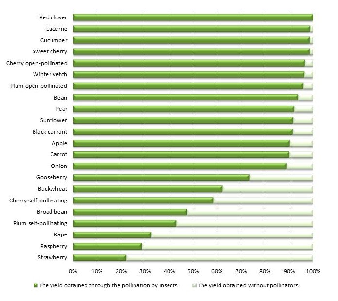 The below graph shows the influence of pollination on fruit and seed yield of some plants. In vast majority of cases yield increase is obvious. Raspberry and strawberry presented at the bottom of the graph seem to have little demand for pollinators but the yield obtained without them, lower by 25-30%, is of much worse quality. These fruits can be used only as a cheap raw material for the processing industry and cannot be sold as dessert fruit that are more expensive.